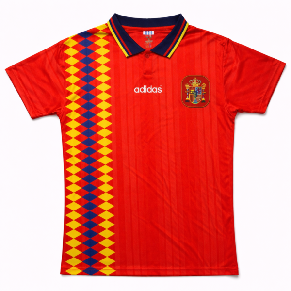 Camisa España 1994 Local Rojo Vino Con Detalles En Azul Oscuro Y Amarillo